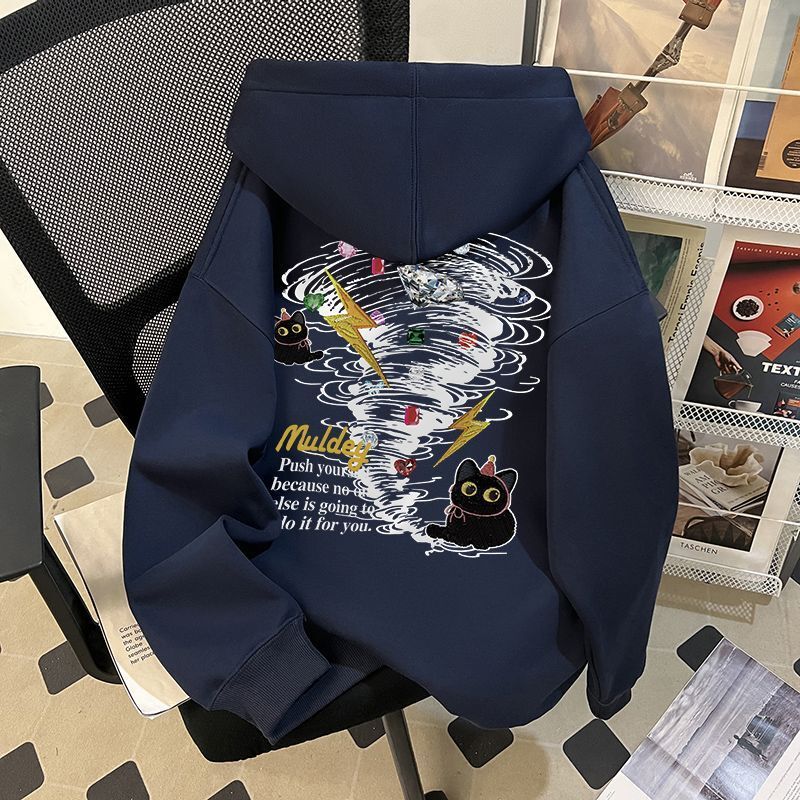 银狐绒新款印花美式连帽男女秋冬季卫衣情侣宽松加绒学生上衣外套