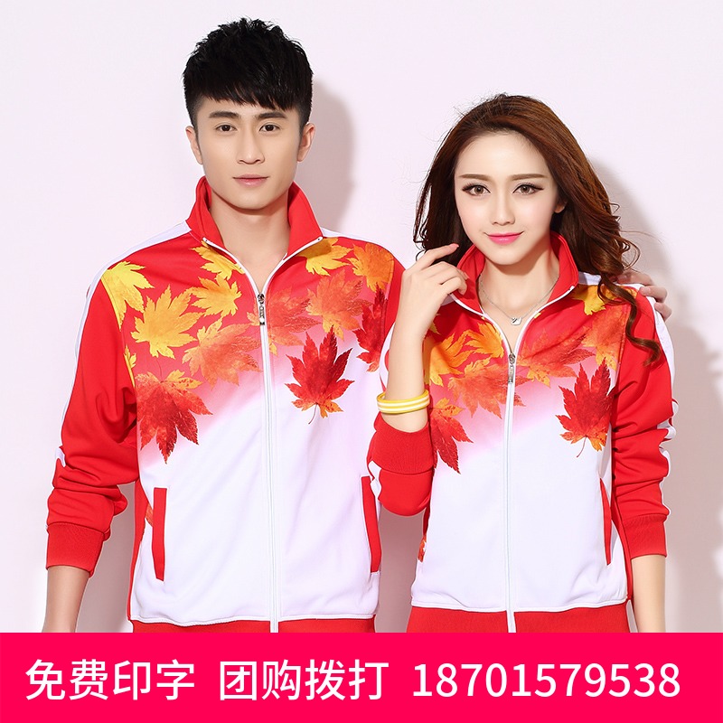 中老年佳木斯健身操广场舞运动服装秋冬男女长袖大码枫叶套装校服