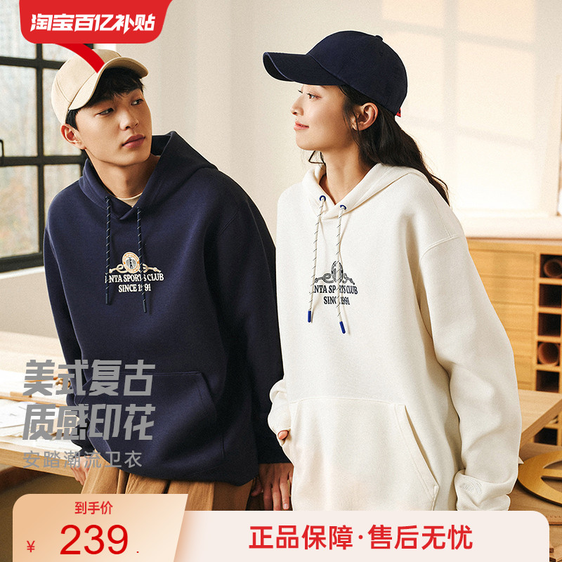 安踏情侣连帽套头卫衣男女2025新款简约休闲宽松加绒潮流长袖上衣
