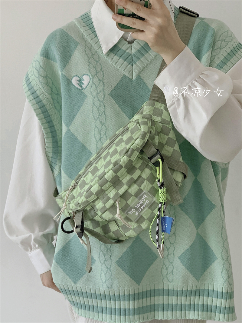 棋盘格子复古小众胸包女斜挎腰包男日系ins荧光绿工装运动小包包