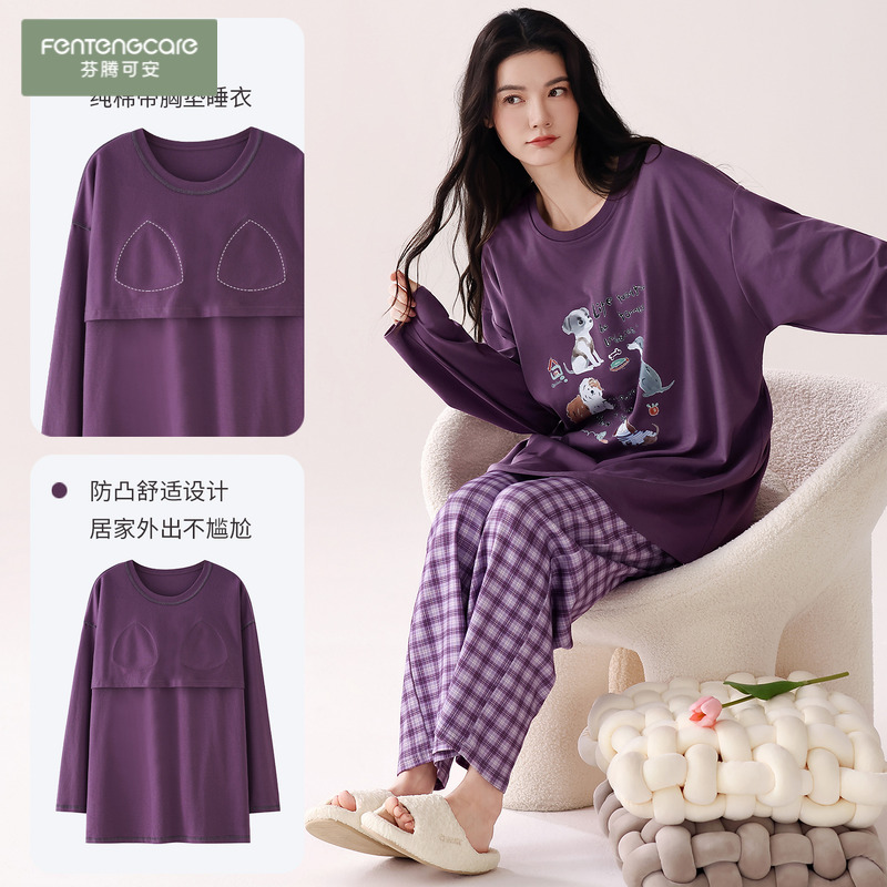 芬腾可安睡衣女款春秋纯棉长袖带胸垫2025新款妈妈家居服女士套装