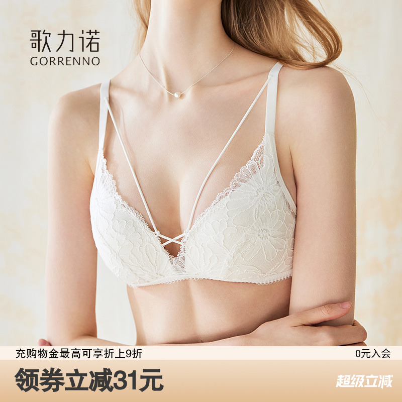 歌力诺小胸聚拢内衣女性感蕾丝三角杯美背白色薄款文胸罩法式套装
