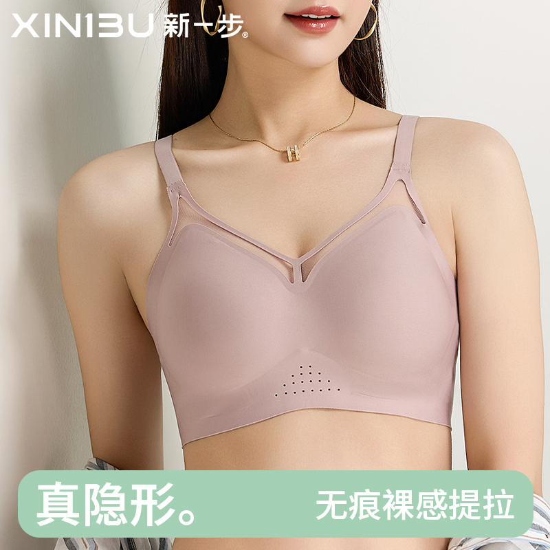 新一步内衣女无感提拉上托加宽肩带侧比收副乳网纱镂空透气文胸罩