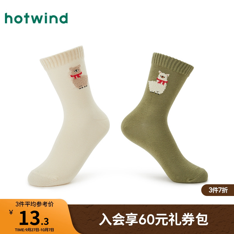 热风2024年秋季新款女士时尚动物提花中帮袜卡通小熊可爱中筒袜子