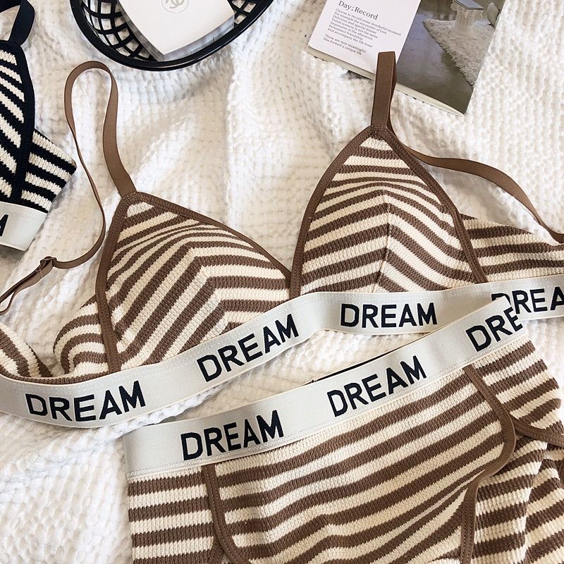 日系撞色条纹无钢圈三角杯运动内衣套装上托聚拢显瘦舒适文胸奶罩