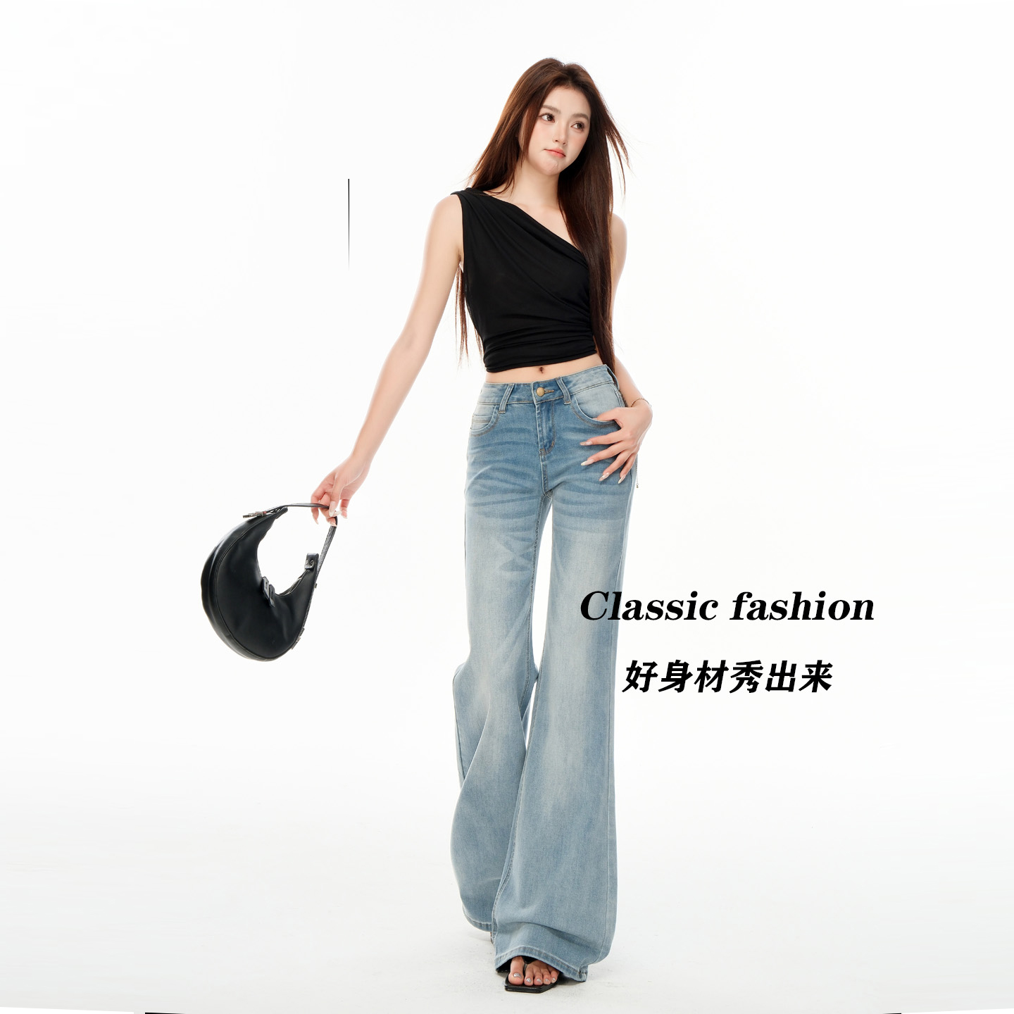 韩版复古微喇叭低腰牛仔裤女夏季2025新款弹力修身显瘦马蹄拖地裤