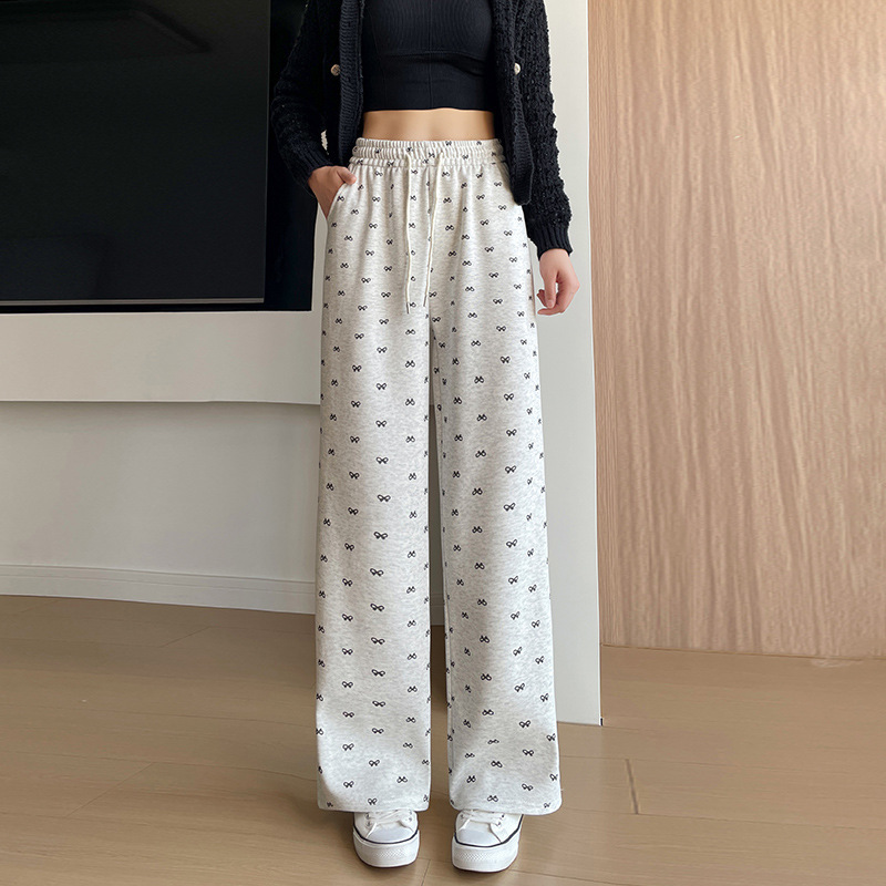 跨境华棉棉质蝴蝶结印花休闲裤女秋冬季2025新款垂感直筒运动裤