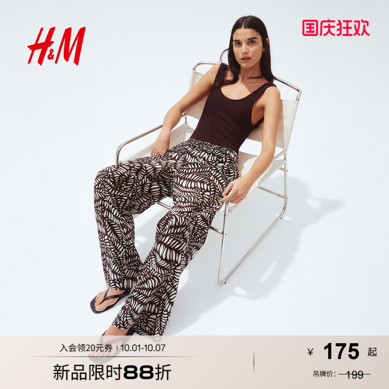 HM女装休闲裤2025秋新款直筒印花度假风抽绳设计棉质长裤1282506