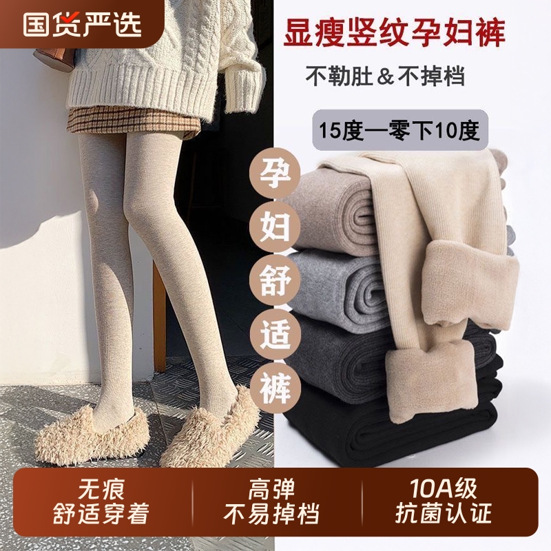 婧麒孕妇打底袜秋冬外穿竖条纹连裤袜加绒厚保暖棉打底裤子孕妇装