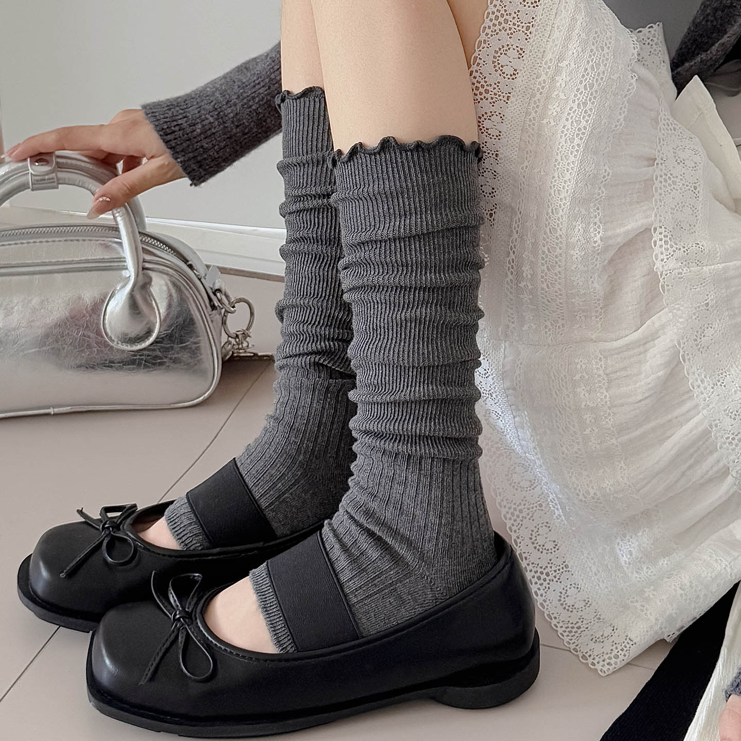 芭蕾风木耳花边小腿堆堆袜春秋竖纹防滑踩脚袜套显瘦日系纯色腿套