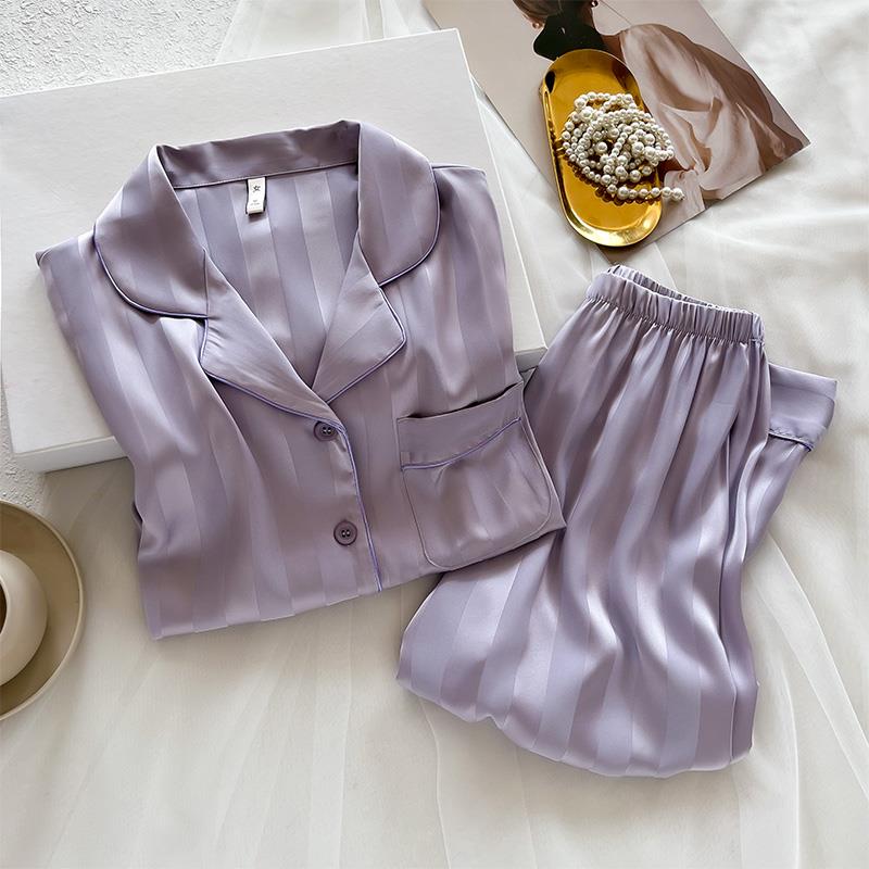 维多利亚真丝睡衣夏季春秋款女桑蚕丝高级感薄丝滑灰紫短袖长裤