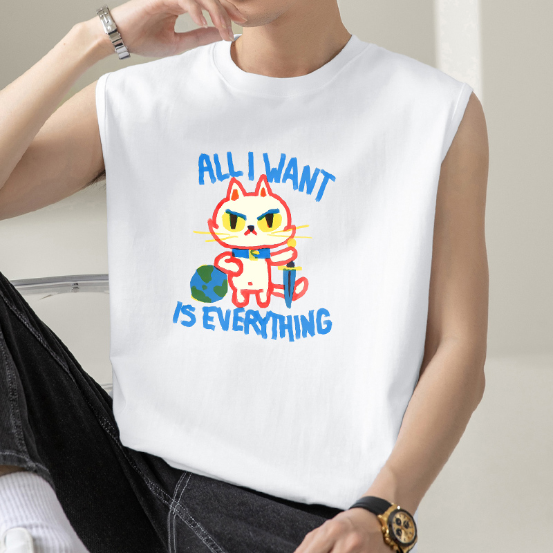 印花汗衫坎肩t恤宽松美式男士背心无袖纯棉白色圆领运动打底衣服