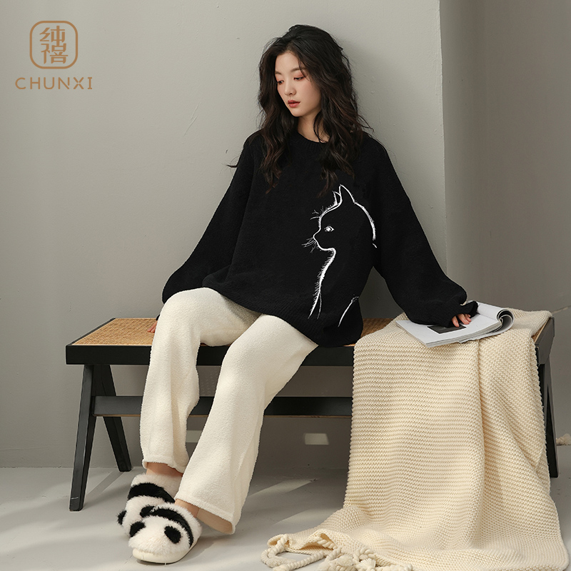 睡衣女秋冬新款软绵绵半边绒卡通慵懒猫条纹长裤可外穿家居服套装