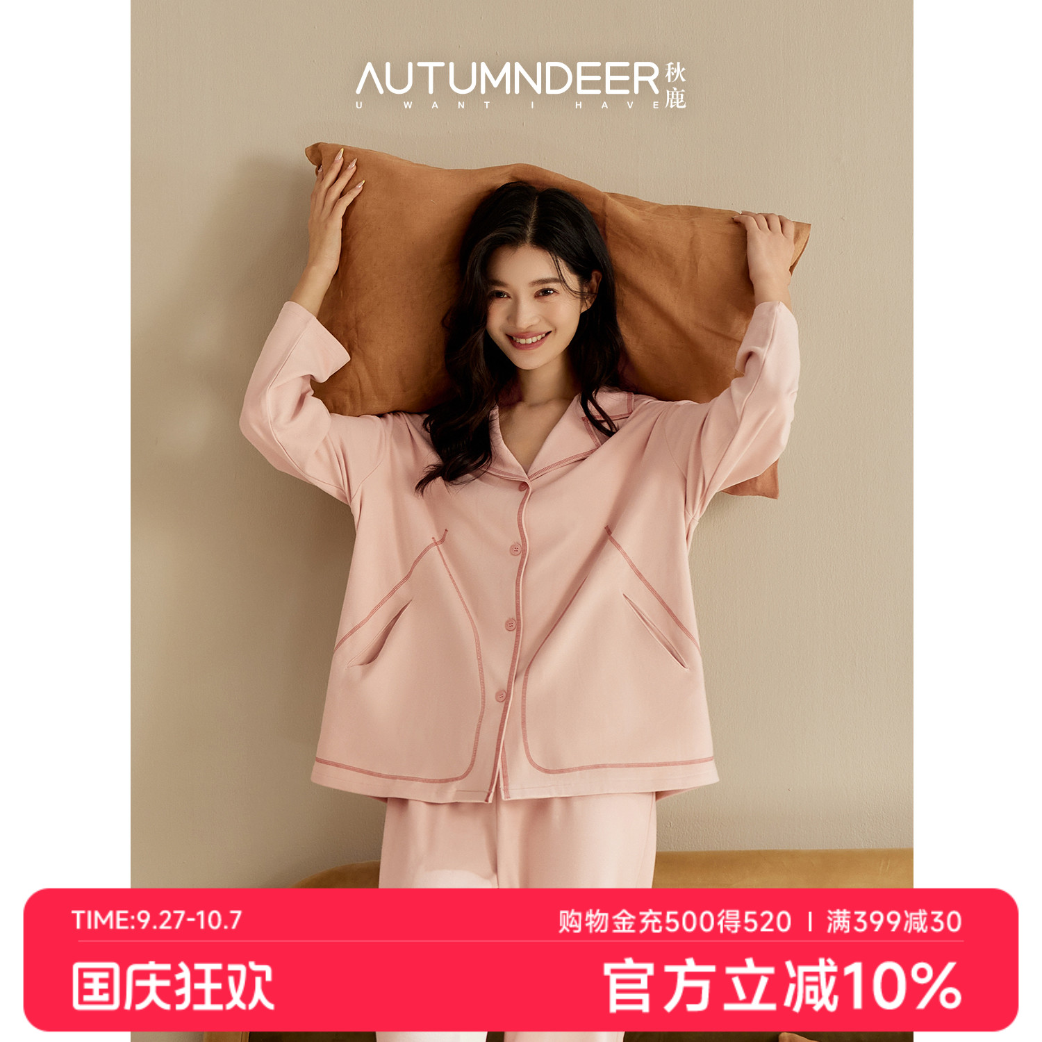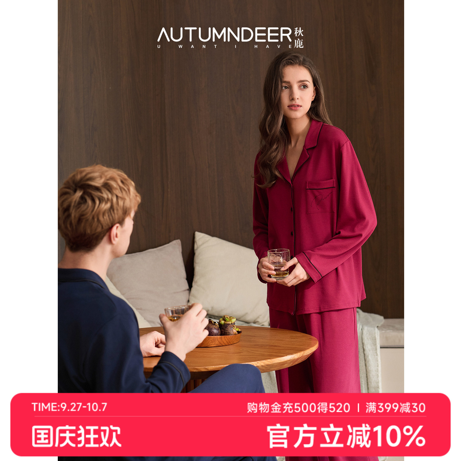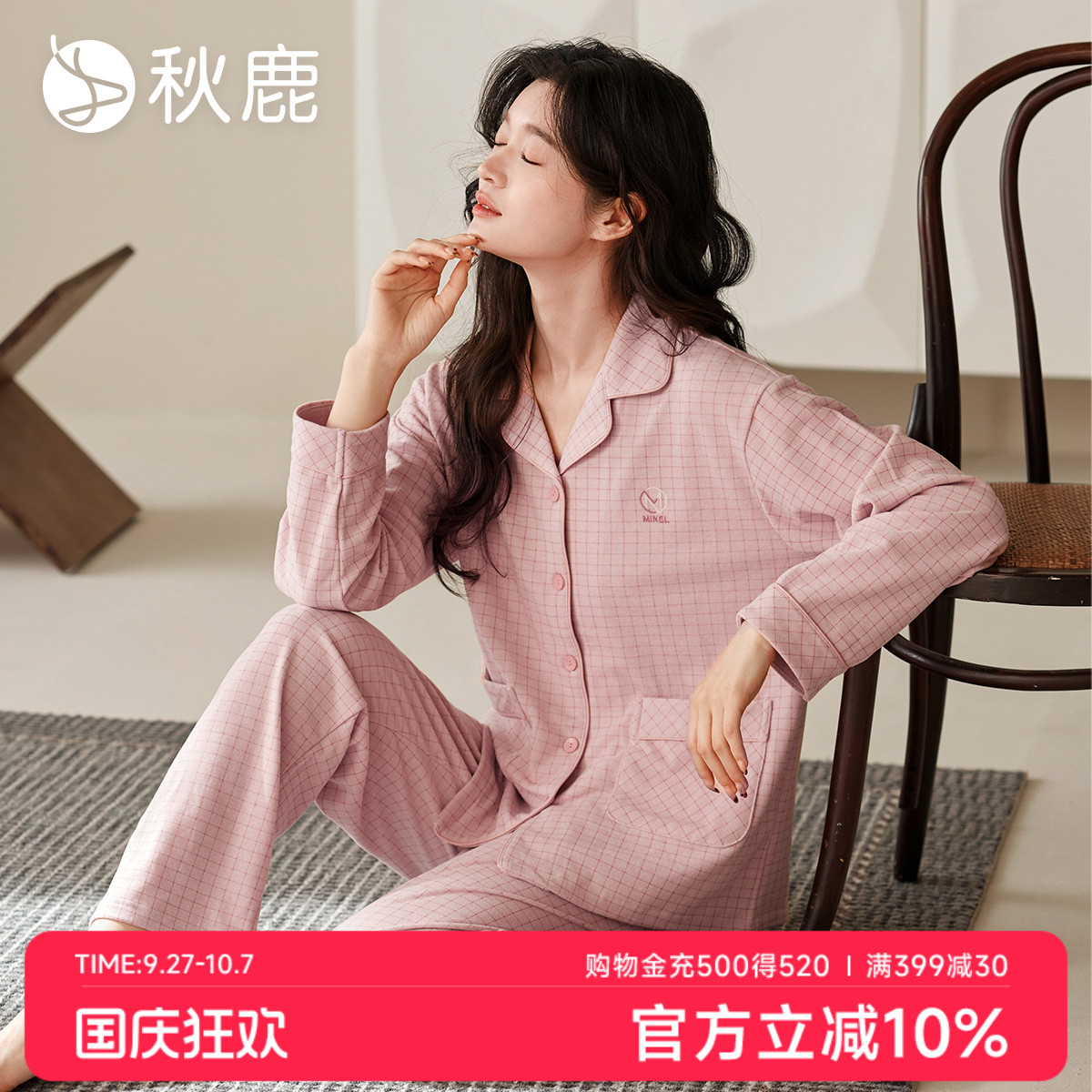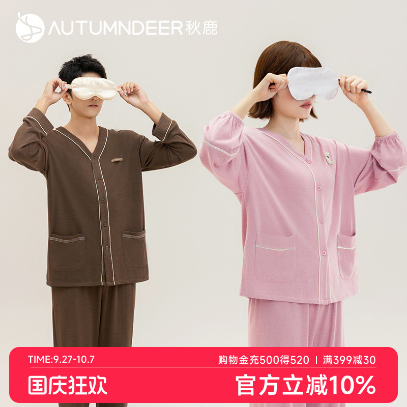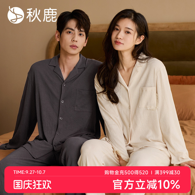 秋鹿【高级感纹理】情侣睡衣女春秋季柔软棉抑菌可外穿家居服男