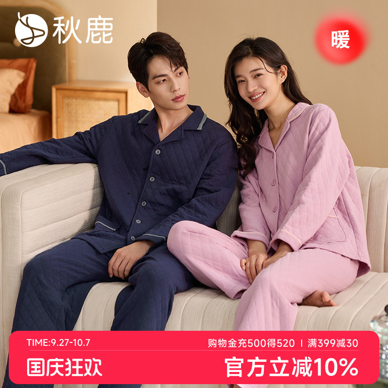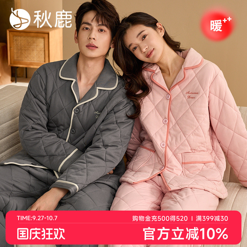 秋鹿【发热纤维】空气棉三层夹棉睡衣女秋冬款情侣男家居服套装