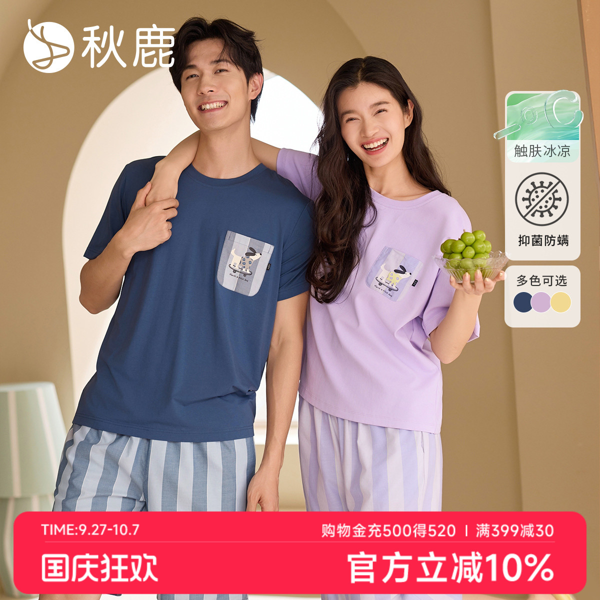 秋鹿柔软舒适凉感纯棉睡衣女2025夏新款卡通短袖长裤情侣男家居服