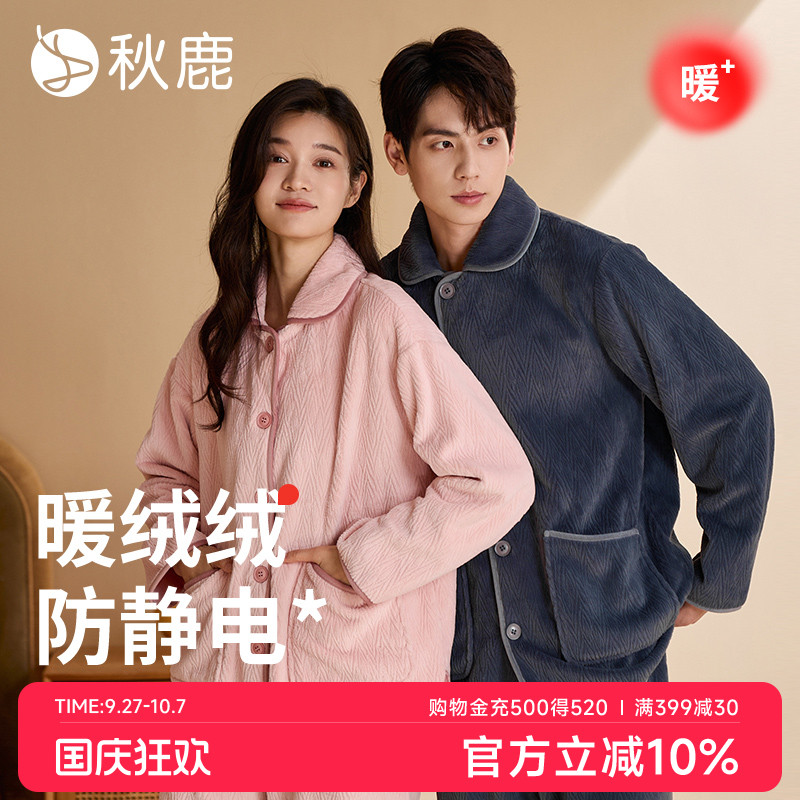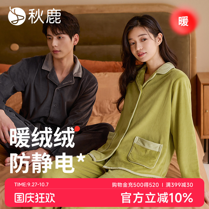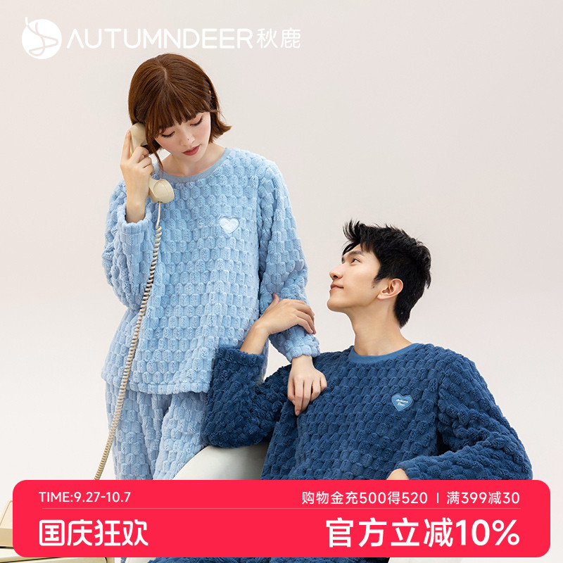 秋鹿珊瑚绒睡衣情侣加厚云感蓄温保暖防螨抗静电男女士家居服套装
