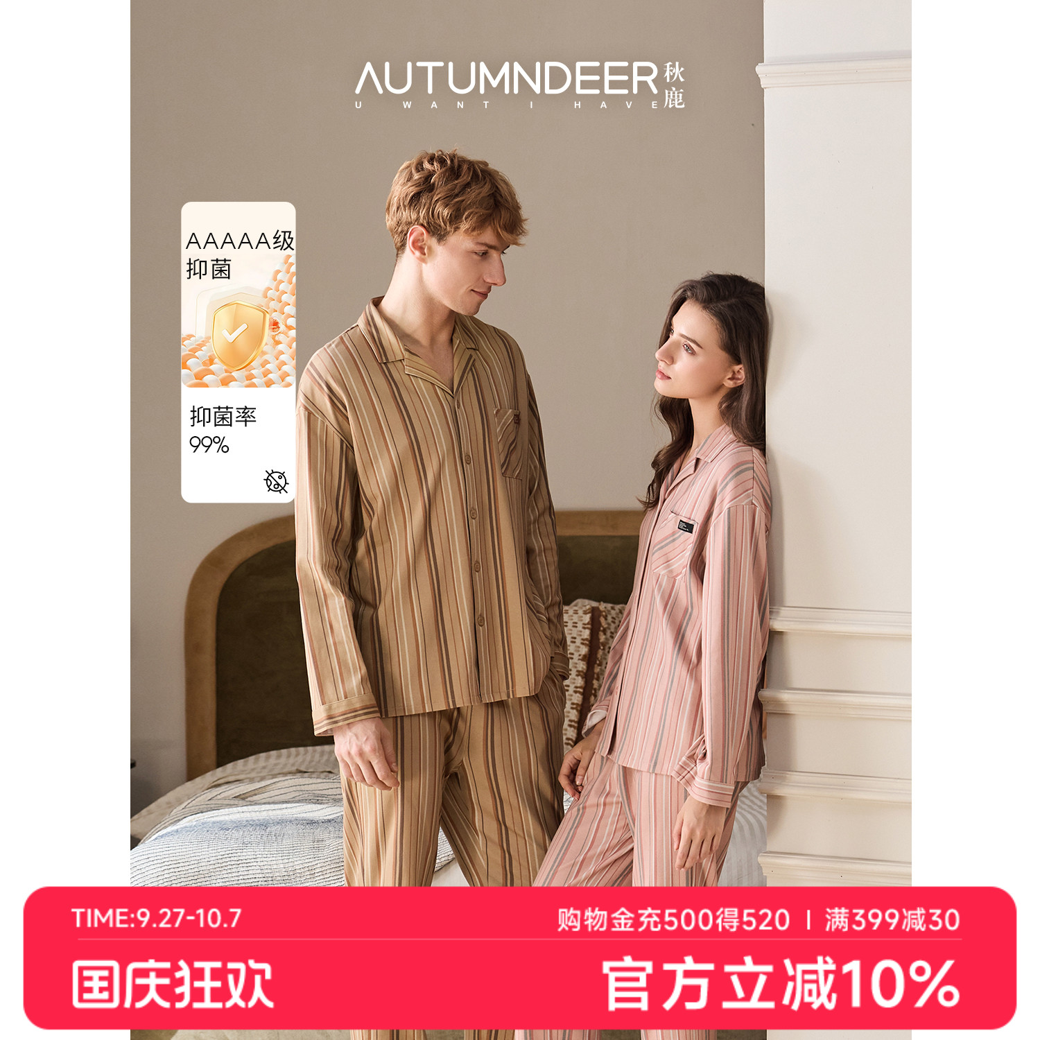 秋鹿【超柔软】纯棉抑菌睡衣女秋季条纹长袖长裤情侣家居服男