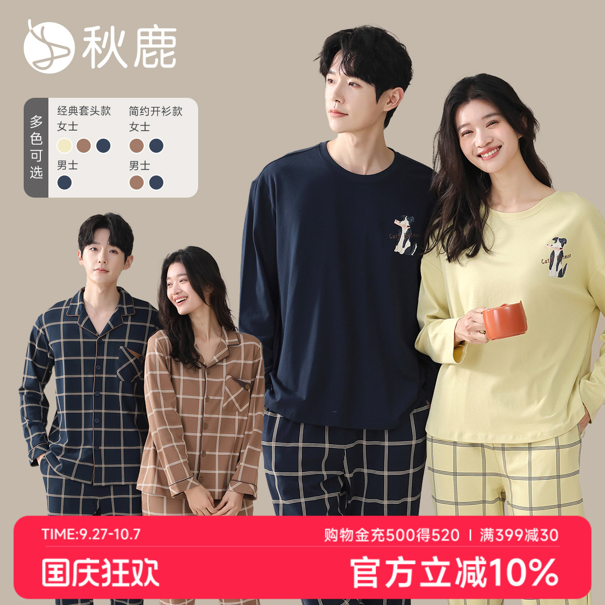 秋鹿【开衫清仓】纯棉情侣睡衣女春秋长袖秋季全棉男士家居服套装