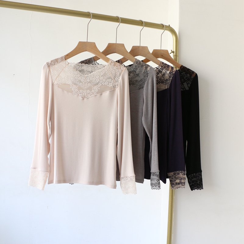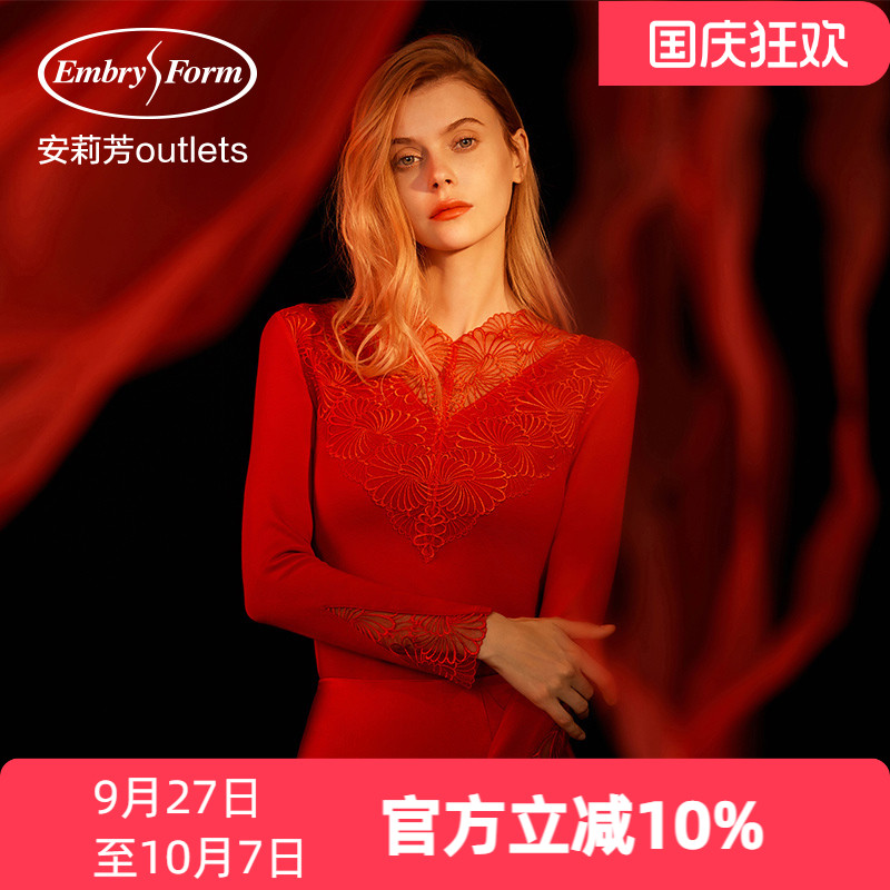 安莉芳官方奥莱蕾丝性感秋衣棉毛衫弹力紧身暖肤衣女士打底上衣女