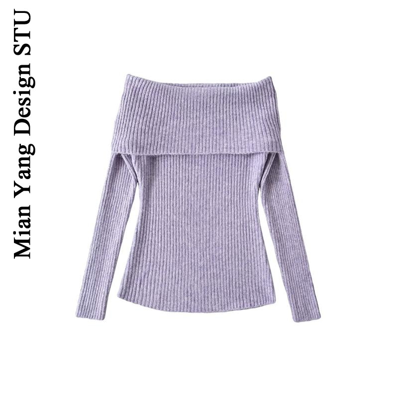 棉村 设计感露肩性感不对称系带针织衫上衣女一字肩辣妹打底毛衣