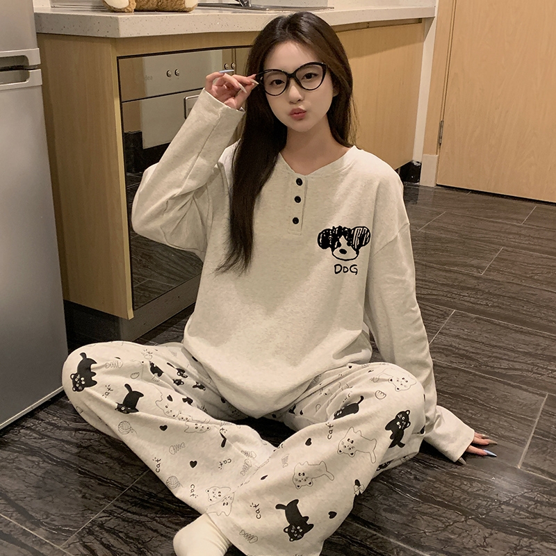 悦内睡衣女春秋款秋季纯棉长袖家居服休闲卡通狗宽松大码时尚套装