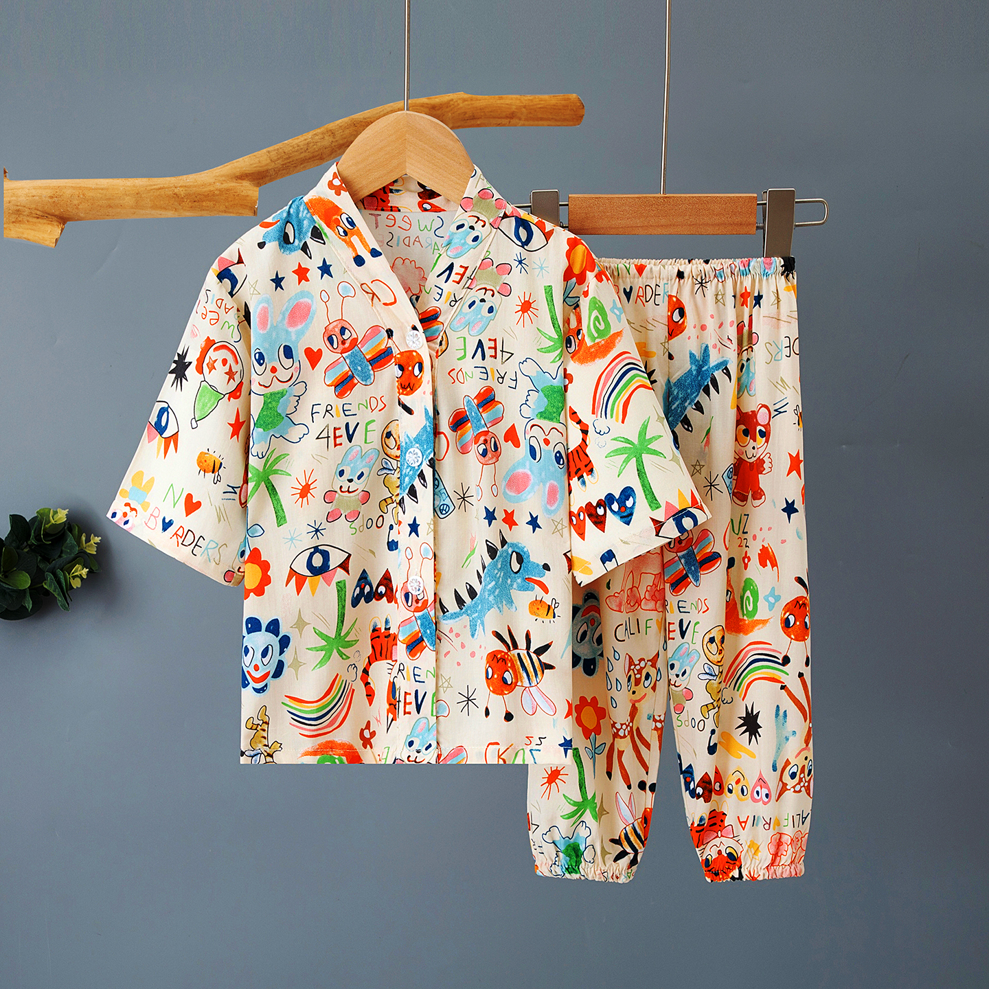 儿童棉绸睡衣薄款男童小孩绵绸夏季天空调家居服中大童乱涂鸦套装