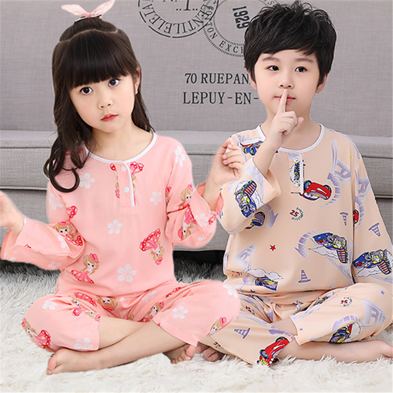 儿童睡衣男孩夏季棉绸中大童套装男童女童女孩睡衣小孩绵绸薄长袖