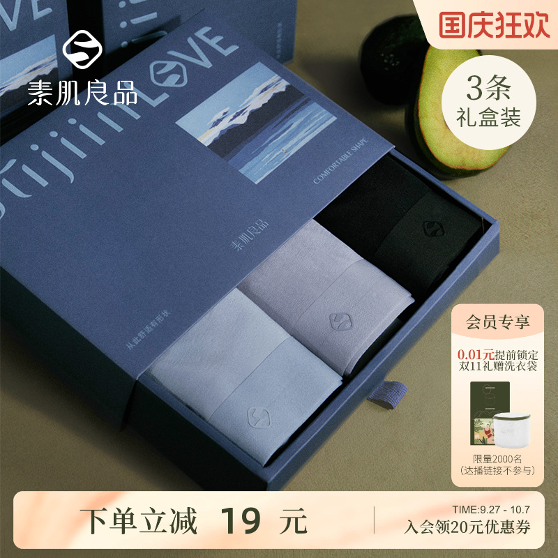 素肌良品男士内裤莫代尔抗菌透气四角裤纯棉裆平角短裤3条礼盒装