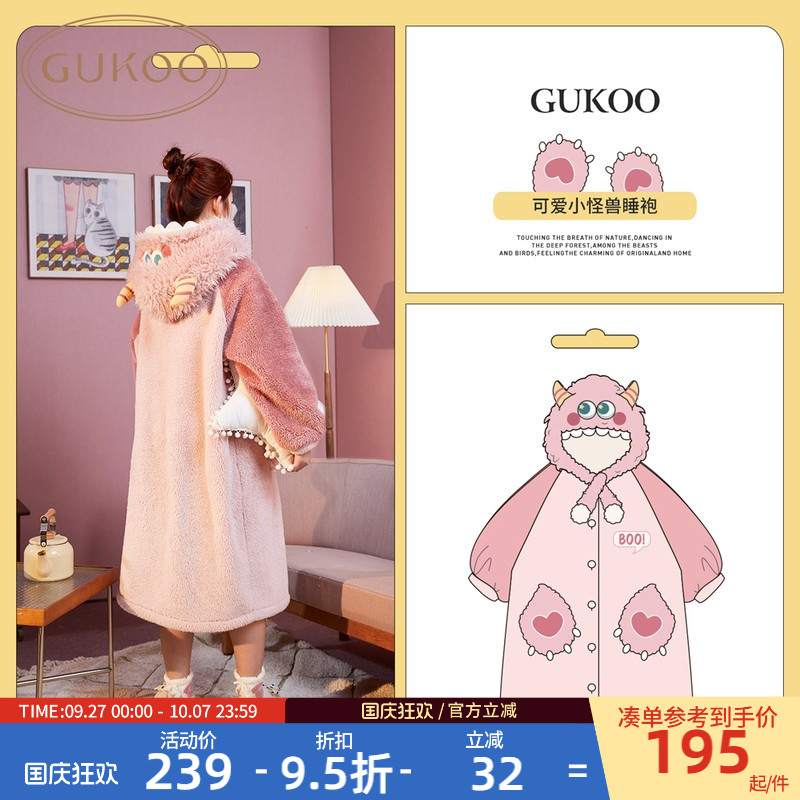 芬腾女士睡裙秋冬季珊瑚绒睡衣甜美可爱休闲加绒加厚中长款家居服