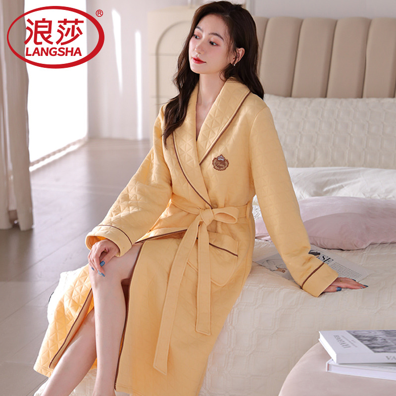 浪莎睡袍女秋冬季长袖加厚夹层薄浴袍空气棉大码中长款冬天家居服