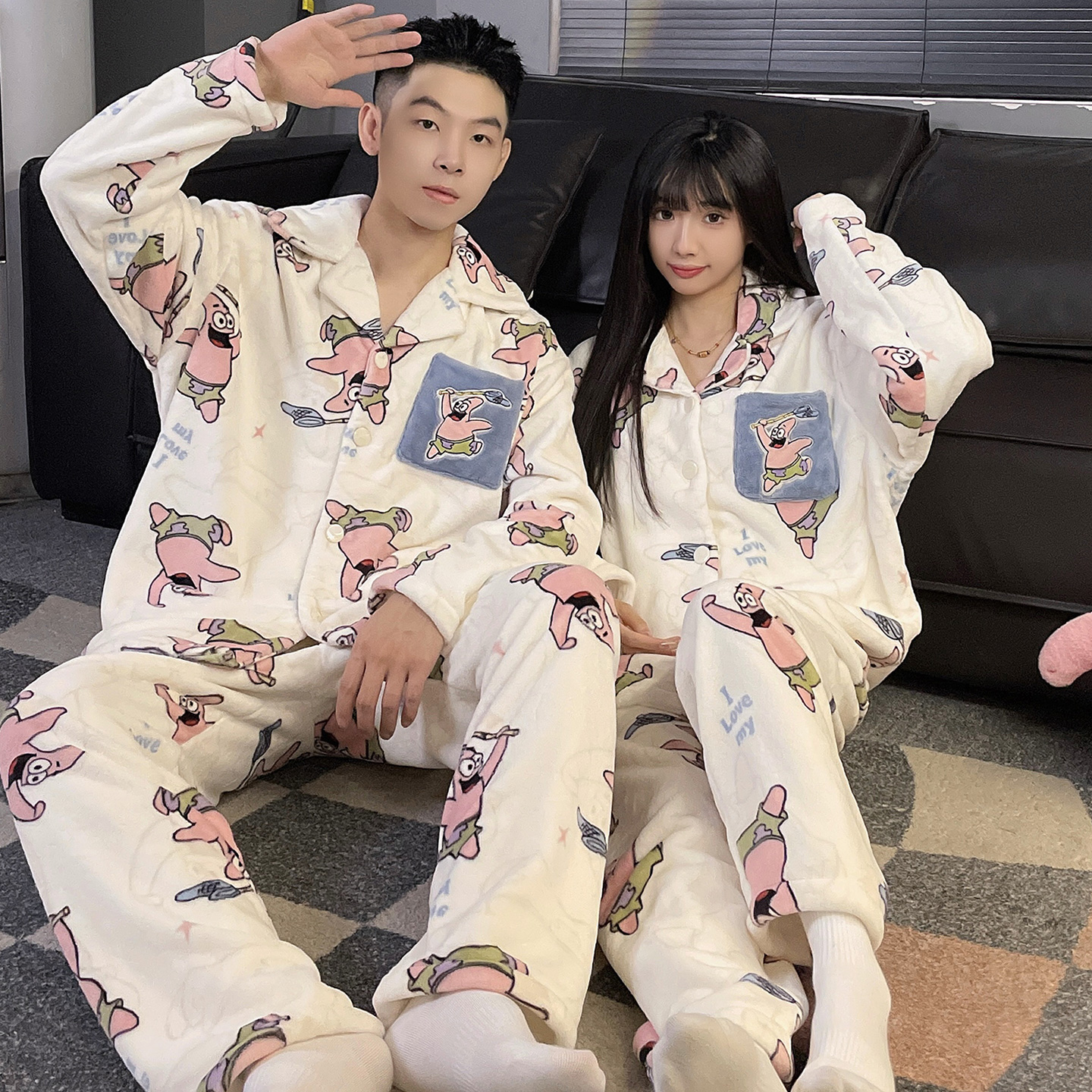顶瓜瓜顶呱呱2025新法兰绒长袖情侣睡衣男士家居服套装珊瑚绒翻领