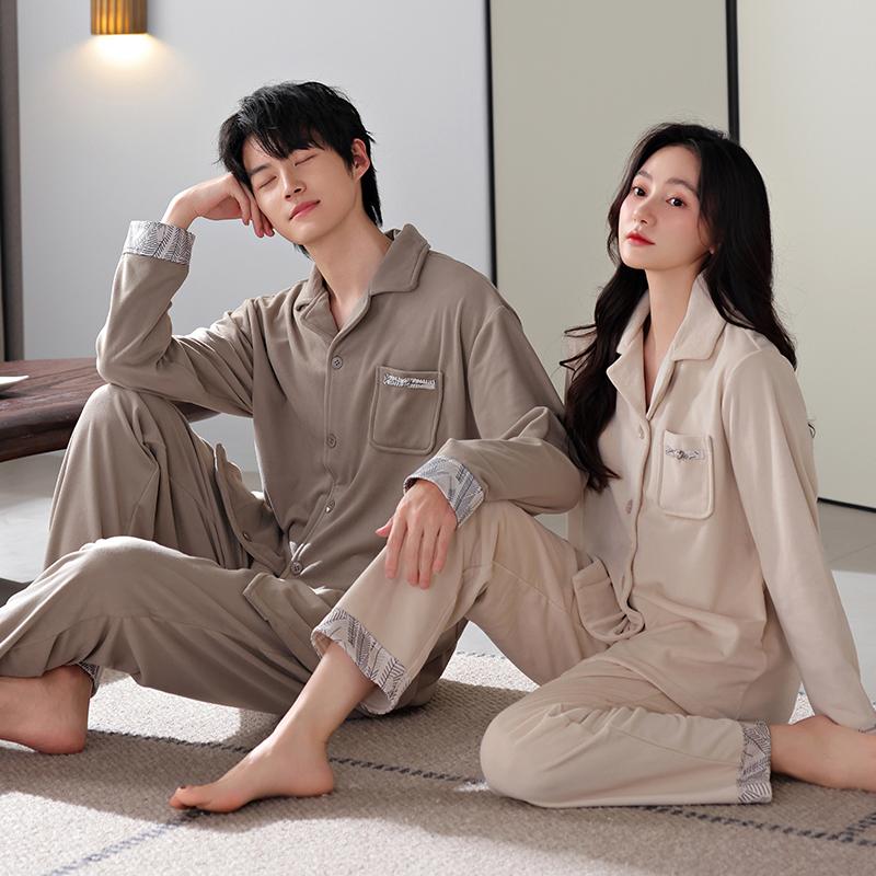 珊瑚绒情侣睡衣春秋长袖简约休闲男女家居服套装可外穿两件套