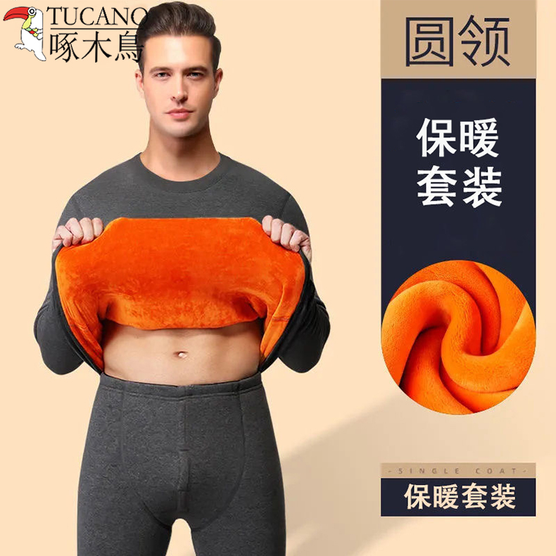 啄木鸟保暖舒适男士打底套装冬季加绒加厚纯色百搭修身显瘦秋衣裤