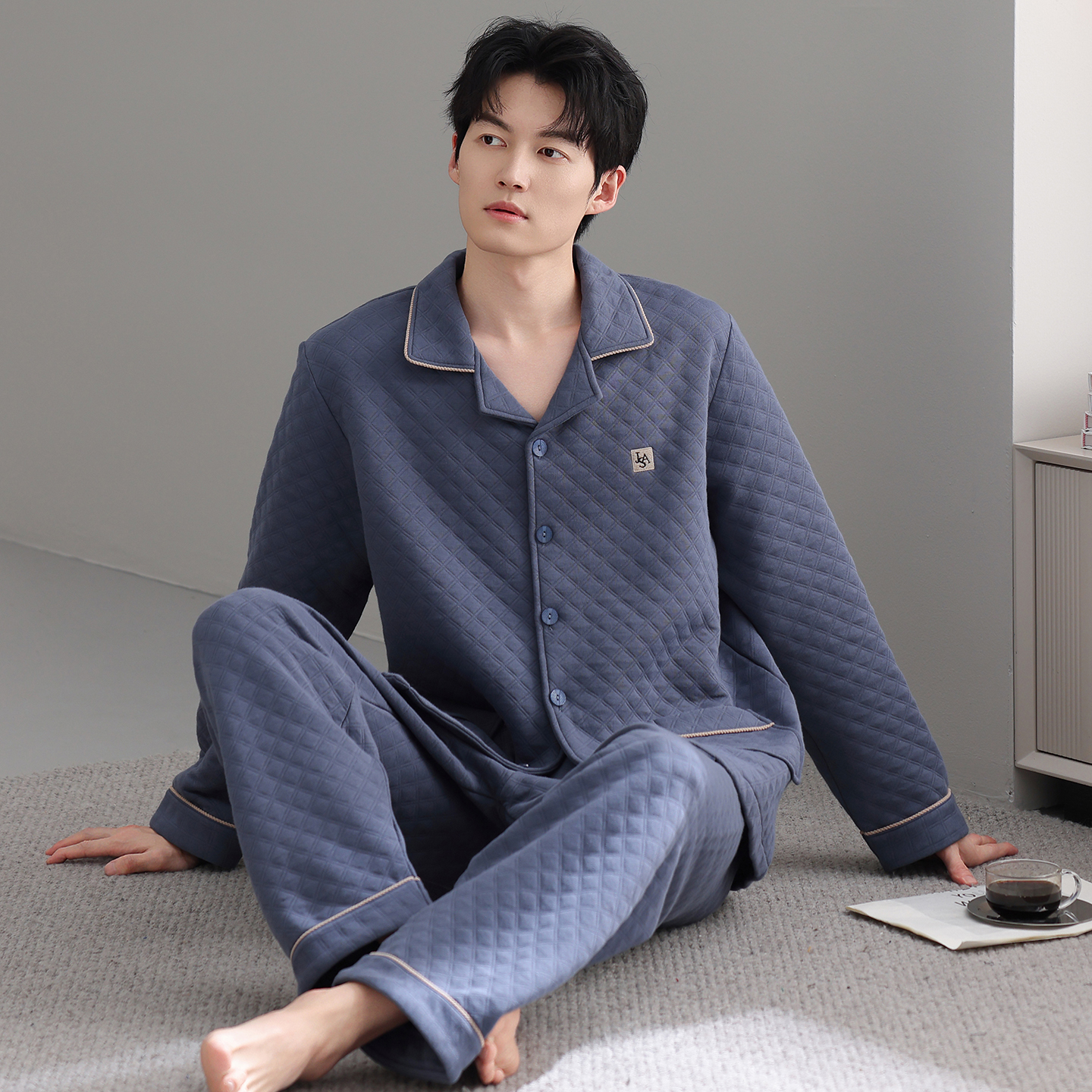 芬腾可安秋冬夹层睡衣男长袖薄夹棉中老年爸爸空气棉质加厚家居服
