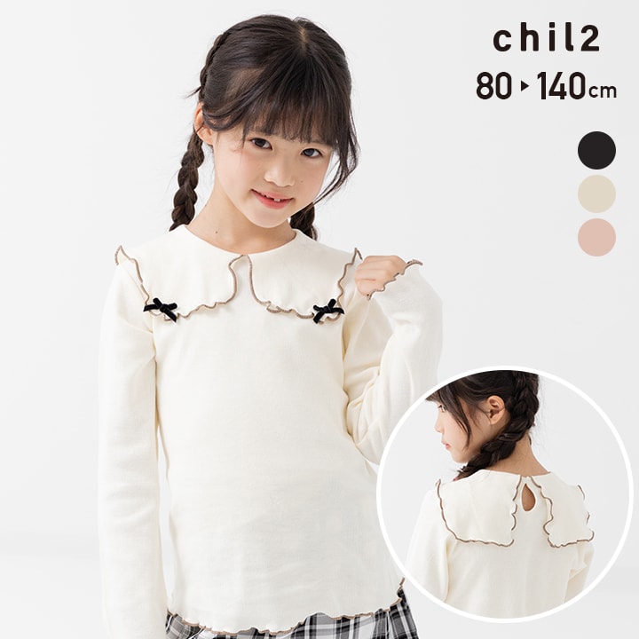 日本 chil2 2024春秋女童装车缝线海军领荷叶花边长袖上衣打底衫