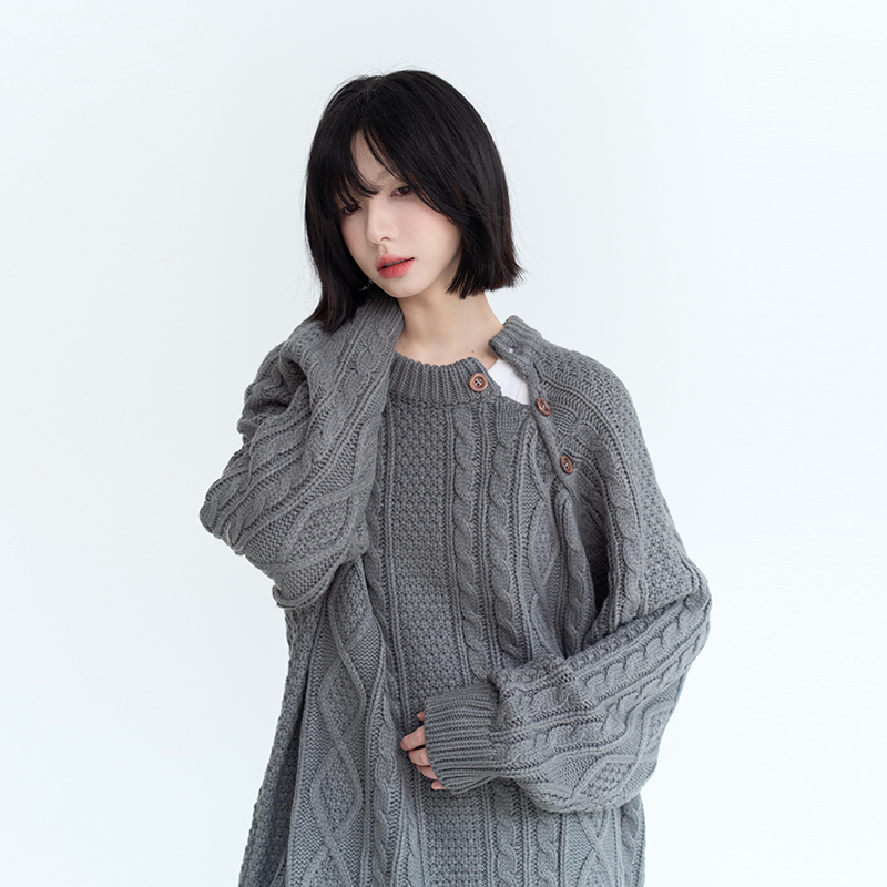 韩国chic秋冬温柔慵懒风圆领侧边纽扣麻花纹设计宽松长袖针织毛衣