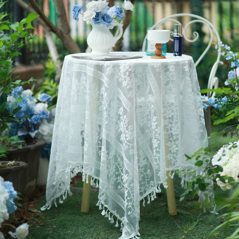 美式田园风摆摊展示盖布花束提花白色蕾丝荷叶边方形桌布装饰餐厅
