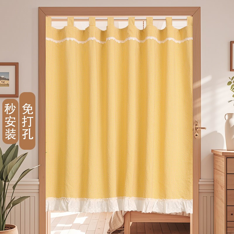 日系小清新格子隔断帘免打孔厨房餐厅卧室卫生间布艺遮光门帘定制
