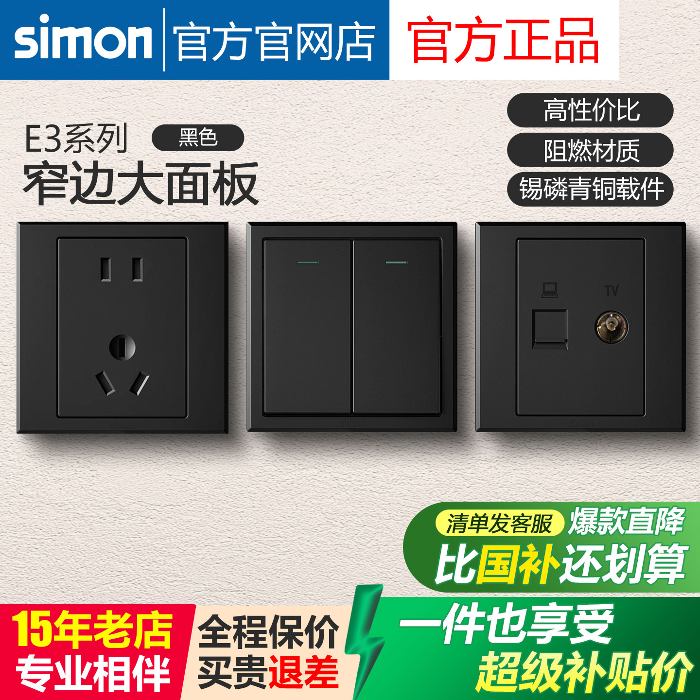 西蒙开关插座E3黑色系列家用五孔USB插座面板86型电源暗装simon