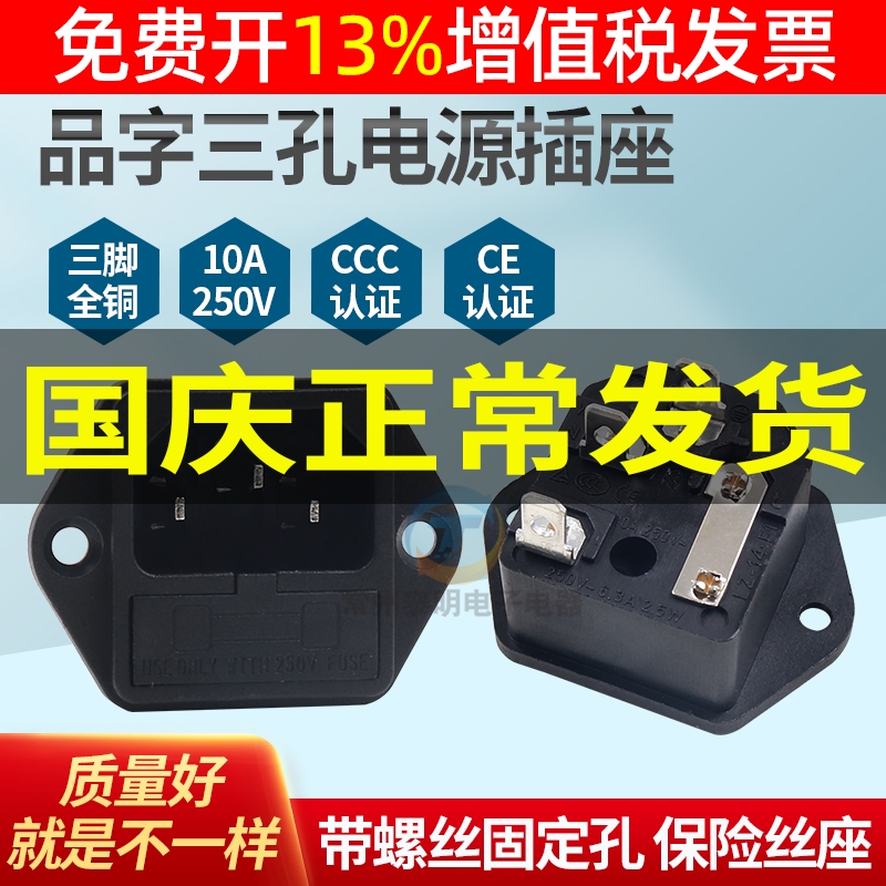仪器品字型电源插座带保险丝固定螺丝耳朵全铜脚宽4.8mm三头眼3孔