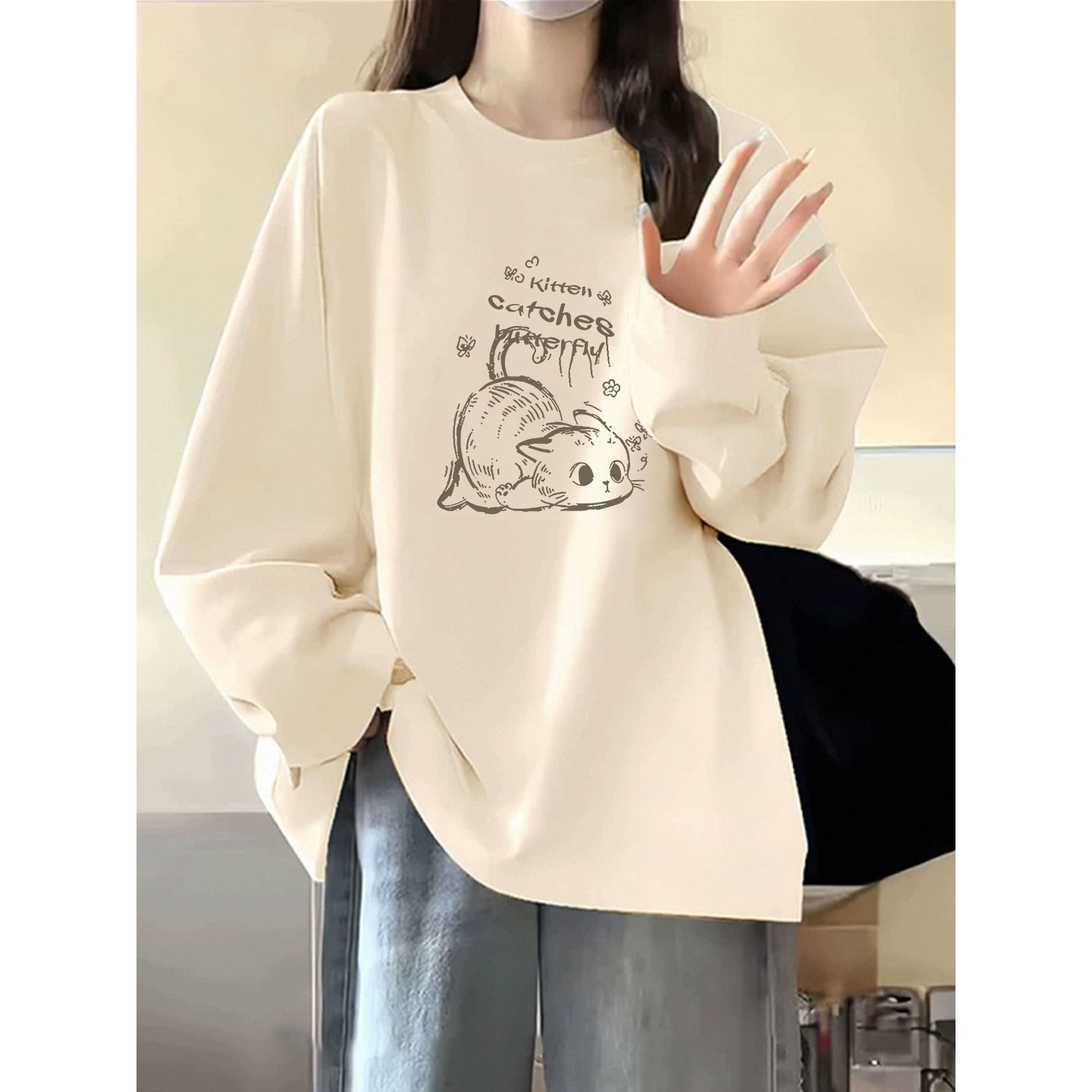 纯棉大码洋气打底衫女装秋冬季新款圆领宽松创意长袖t恤卫衣外穿