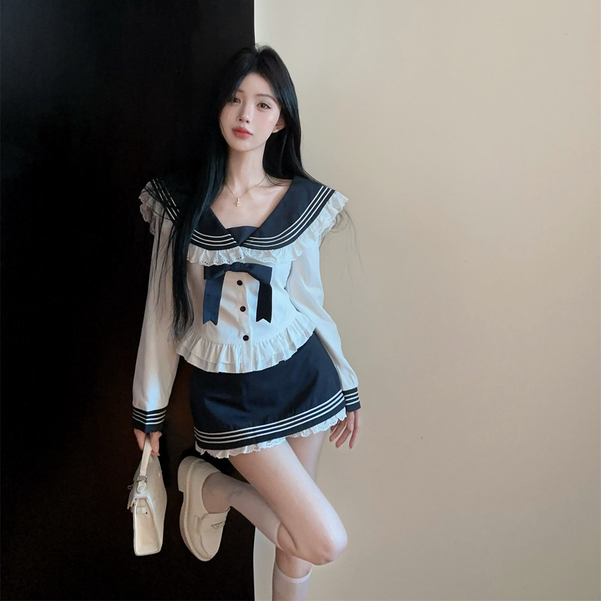 学院风海军领设计收腰修身显瘦长袖衬衫上衣女高腰半身裙两件套秋