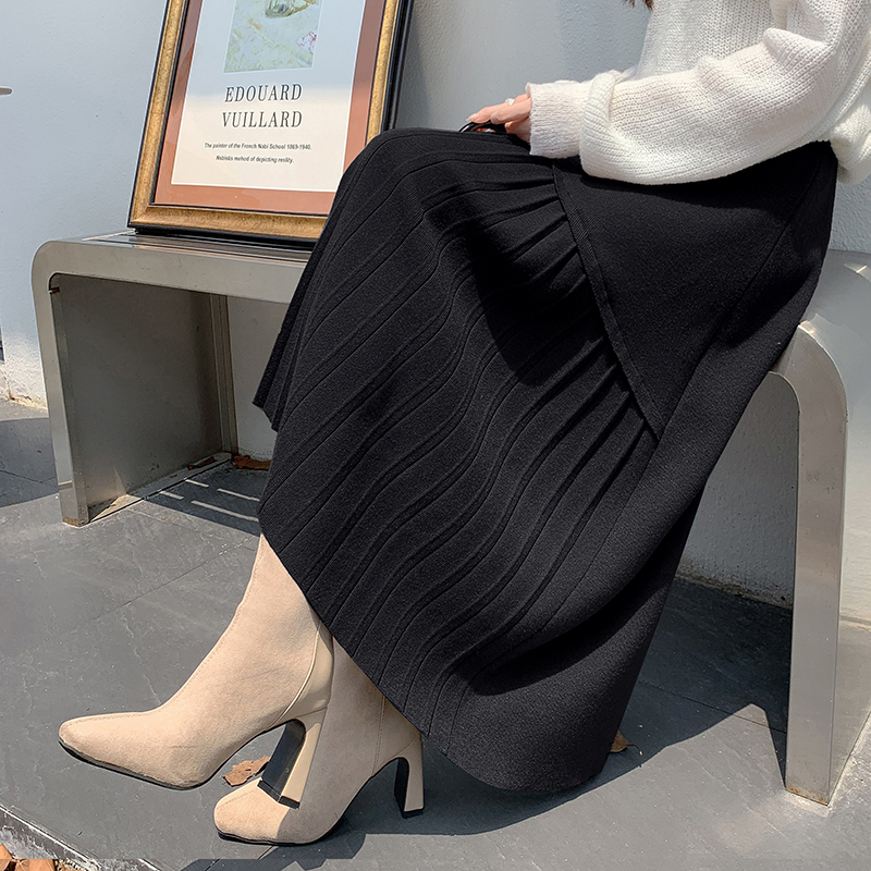 实拍黑色针织半身裙女秋冬韩版高腰A字裙中长款修身不规则百褶裙