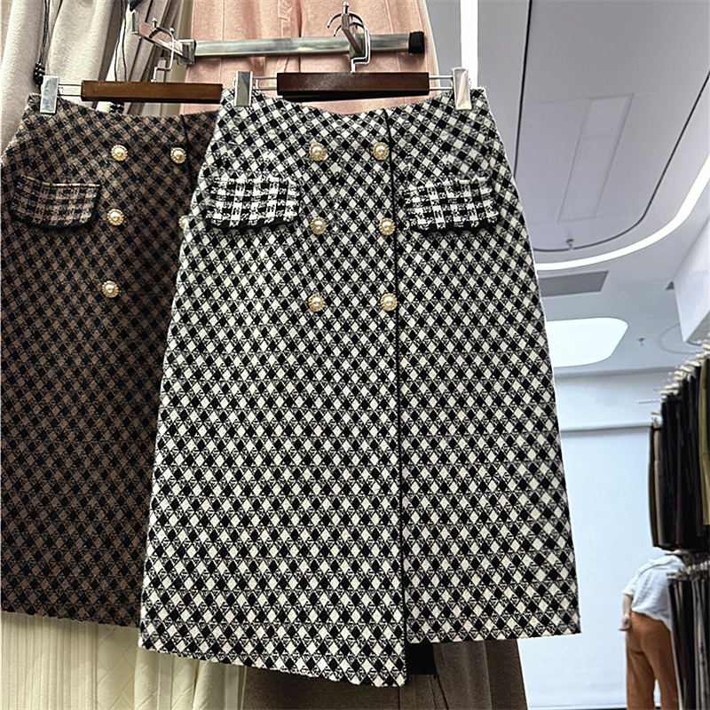 复古千鸟格半身裙秋冬女新款高腰针织中长款不规则裙子包臀一步裙