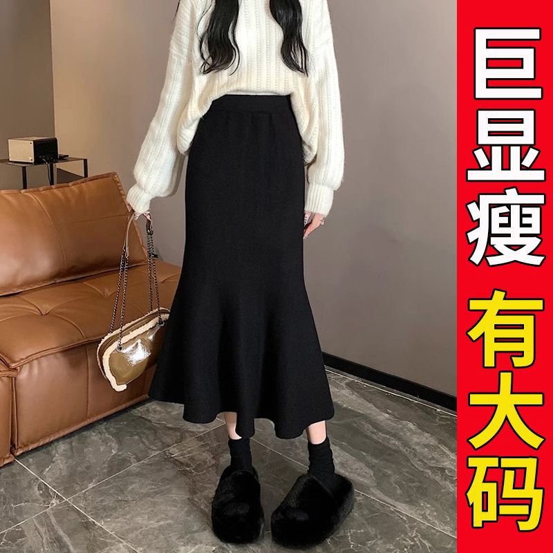 韩系荷叶边针织半身裙女秋季新款大码胖mm不规则显瘦中长款鱼尾裙