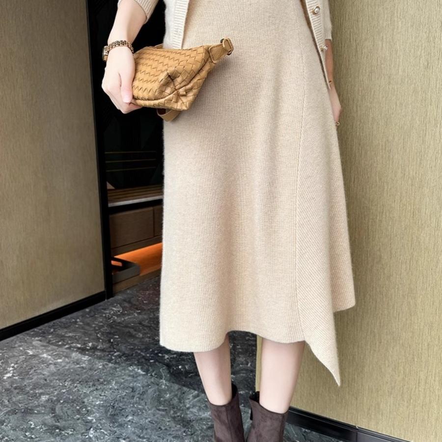 2025新款翻领不规则收腰气质针织毛衣中长款外套女半身裙两件套
