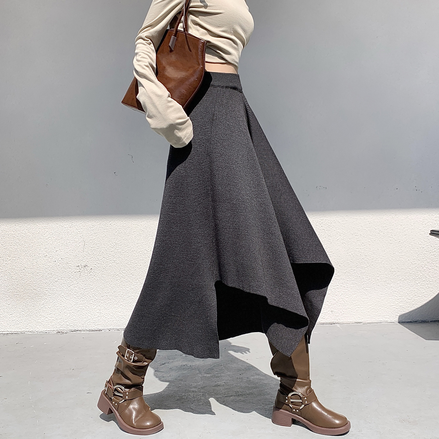 半身裙女秋冬2025新款不规则灰色针织高腰显瘦a字休闲中长款裙子