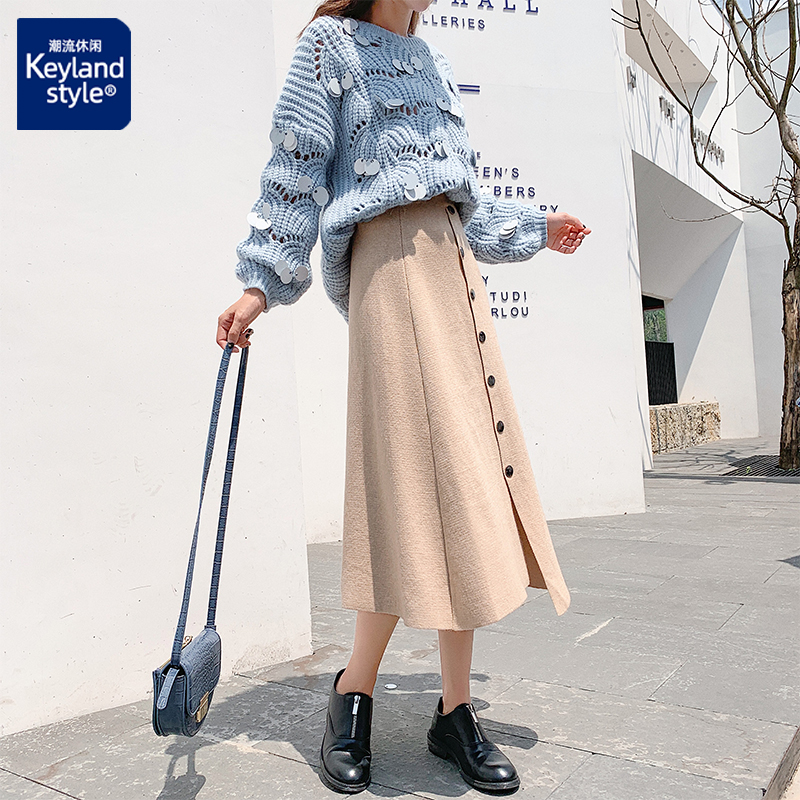 不规则高腰针织半身裙女韩版2019秋冬新款中长款A字大摆长裙百搭