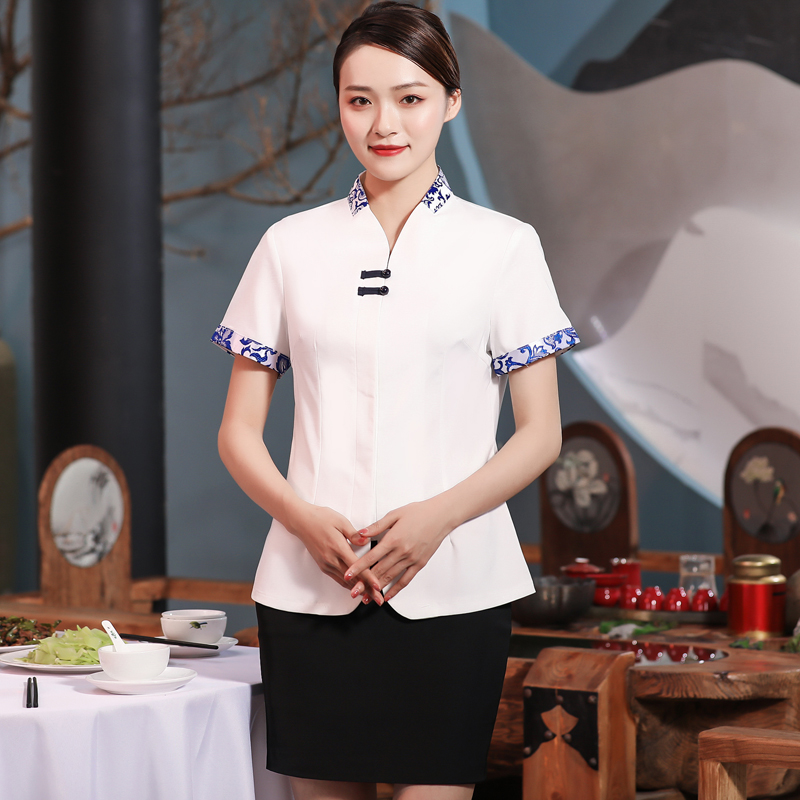 中国风服务员工作服青花瓷短袖半袖男女酒店工作服餐饮茶楼工装制